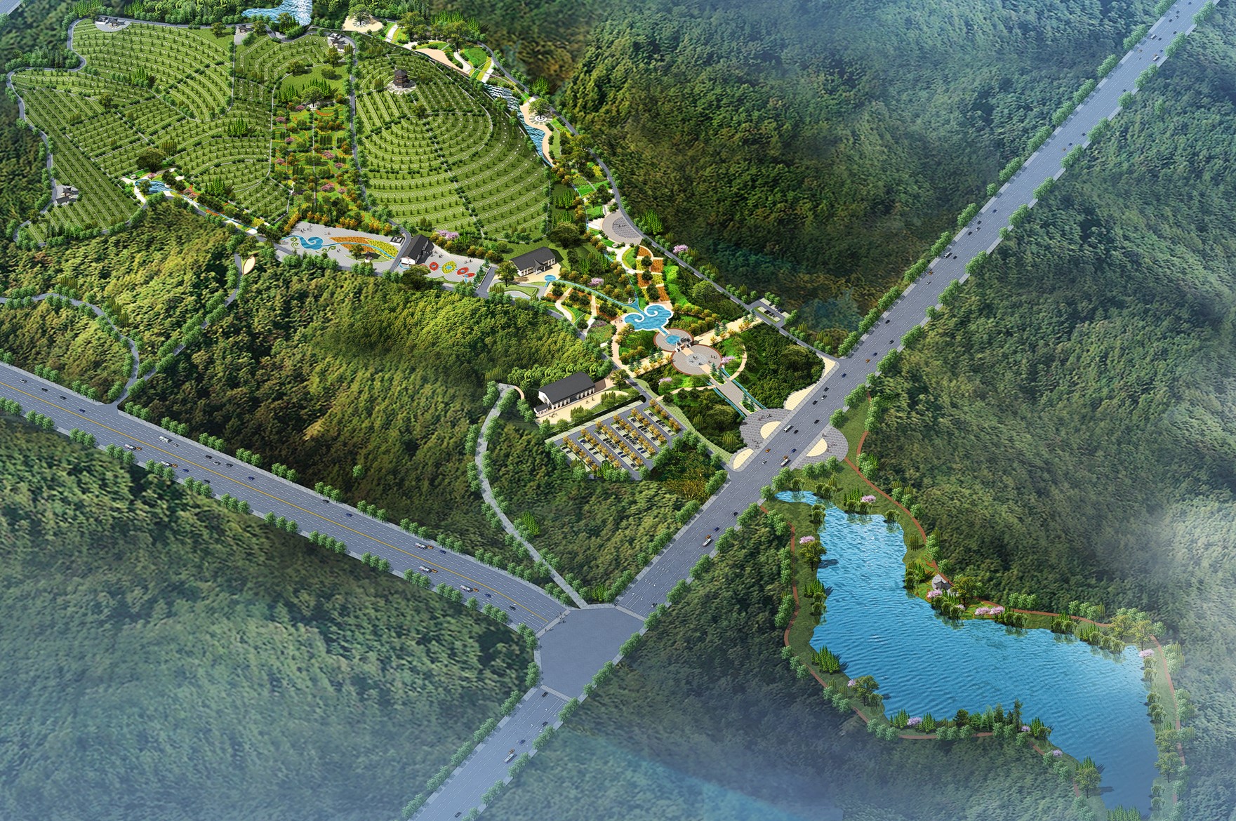 德龍陵園來龍于昆侖山系,屬翠峰山主脈延伸到石馬龍山的團(tuán)山結(jié)穴而建,面朝小閘水庫(kù),太和山與寥廓山左右環(huán)抱,園區(qū)巒聳翠、水映霞輝、山環(huán)水繞、郁郁蔥蔥,有五龍捧圣之勢(shì),冠以五福臨門之愿,五德傳承之感,使山水人文融為一體,是弘揚(yáng)中華文化的教研基地。